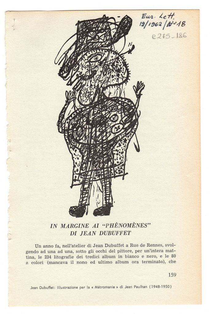 Απόκομμα, χαρτί, 2 φφ, 20,5×13 εκ., στα ιταλικά, δημοσίευσης άρθρου το οποίο αναφέρεται και σχολιάζει σειρά λιθογραφιών του Jean Dubuffet με τίτλο “Phénomènes”.