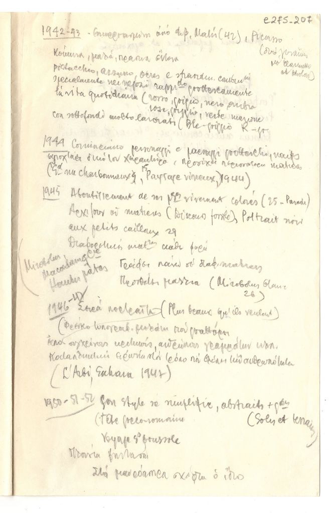 Χειρόγραφες σημειώσεις του Τώνη Σπητέρη για τον Jean Dubuffet, με μολύβι, χαρτί, 28×21 εκ., στα ελληνικά και ιταλικά.