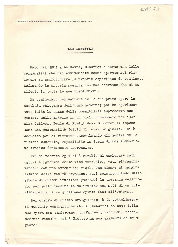 Δακτυλόγραφο έντυπο του Centro Internazionale delle Arti e del Costume, χαρτί, 30×21 εκ., στα ιταλικά, το οποίο περιέχει βιογραφικό σημείωμα του Jean Dubuffet.