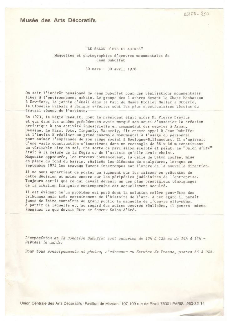 Φωτοαντίγραφο δακτυλόγραφου δελτίου Τύπου, χαρτί, 30×21 εκ., στα γαλλικά, έκθεσης έργων του Jean Dubuffet, η οποία διεξάγεται στο Μουσείο Διασκομητικών Τεχνών στο Παρίσι.