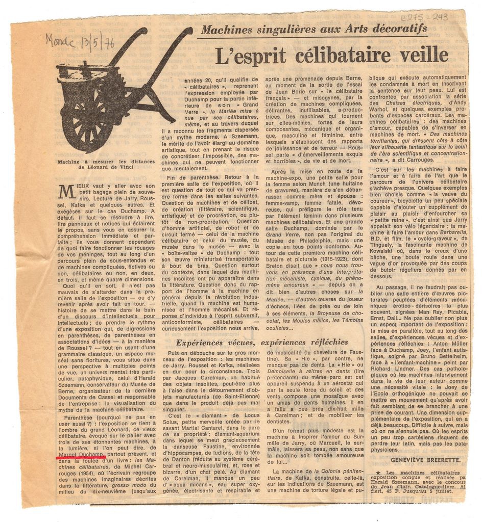 Απόκομμα, χαρτί, 23.5×21.5 εκ., στα γαλλικά, δημοσίευσης κριτικής έκθεσης του Marcel Duchamp, η οποία διεξάγεται στο Μουσείο Διακοσμητικών Τεχνών στο Παρίσι. Γίνεται επίσης αναφορά σε κυκλοφορία σχετικής έκδοσης ενω αναγράφονται λεπτομέρειες και σχόλια αναφορικά με τη μηχανική τέχνη.