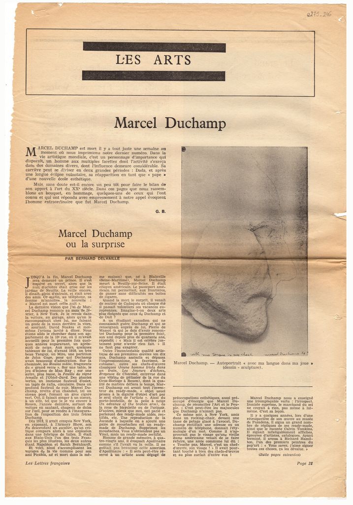 Απόκομμα, χαρτί, 42×30 εκ., στα γαλλικά, δημοσίευσης εισαγωγικού κειμένου το οποίο αναφέρεται σε αφιέρωμα του εντύπου στον Marcel Duchamp, με αφορμή τον θάνατό του.