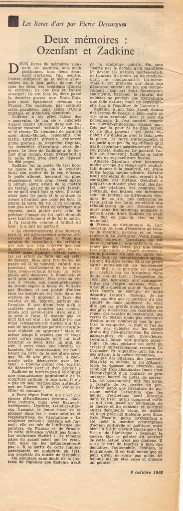 Απόκομμα, χαρτί, 42×30 εκ., στα γαλλικά, δημοσίευσης στήλης του εντύπου, στην οποία σχολιάζονται κυκλοφορίες βιογραφιών των Ossip Zadkine και Amédée Ozenfant που κυκλοφορούν από τις εκδόσεις Albin Michel και Seghers αντίστοιχα.