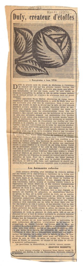 Απόκομμα, χαρτί, 38×11 εκ., στα γαλλικά, δημοσίευσης κριτικής έκθεσης του Raoul Dufy, η οποία διεξάγεται στην Mulhouse.