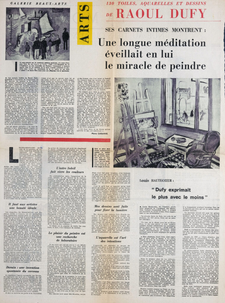 Απόκομμα, χαρτί, 60×43 εκ., στα γαλλικά, δημοσίευσης κριτικής έκθεσης του Raoul Dufy, η οποία διεξάγεται στην Galerie Beaux Arts στο Παρίσι. Στο κείμενό του ο Pierre Cabanne αναφέρεται σε ανέκδοτα σημειωματάρια του καλλιτέχνη, τα οποία παρουσιάζονται στο πλαίσιο της έκθεσης και στα οποία αποκαλύπτονται “μυστικά” για το εικαστικό του έργο.