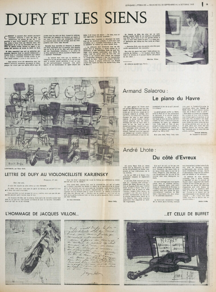 Απόκομμα, χαρτί, 60×43 εκ., στα γαλλικά, δημοσίευσης κειμένου αναφερόμενου σε κυκλοφορία βιβλίου της Marcelle Oudy για τον Raoul Dufy. Στο απόκομμα αναγράφονται αναμνήσεις των Armand Salacrou, André Lhote από τη γνωριμία τους με τον καλλιτέχνη και επιστολή του καλλιτέχνη προς τον βιολοντσελίστα Karjensky.