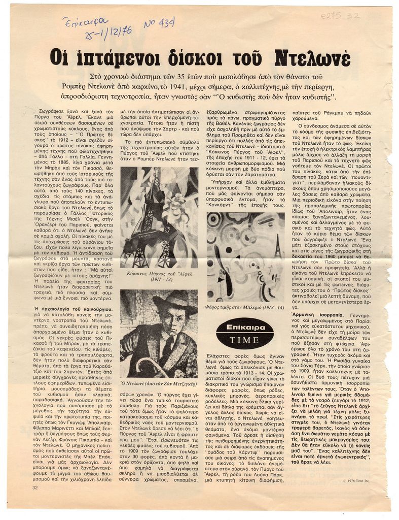 Απόκομμα, χαρτί, 30×21 εκ., στα ελληνικά, δημοσίευσης κειμένου αφιερωμένου στο εικαστικό έργο του Robert Delaunay.