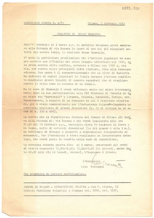 Δακτυλόγραφο δελτίο Τύπου, χαρτί, 30×21 εκ., στα ιταλικά, έκθεσης γλυπτικής του Dusan Dzamonja στο Μιλάνο. Αναγράφονται πληροφορίες για τη διοργάνωση.