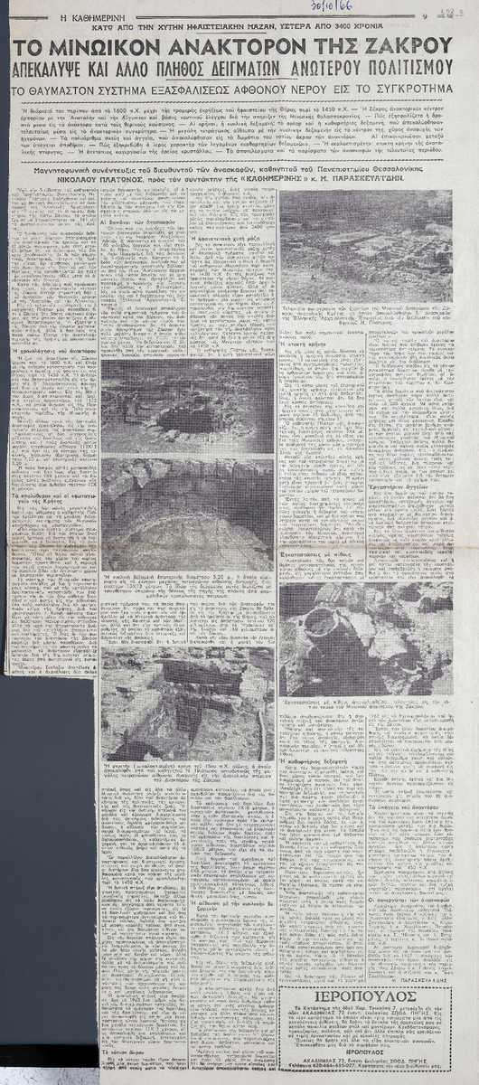 «Το Μινωικόν ανάκτορον της Ζάκρου απεκάλυψε και άλλο πλήθος δειγμάτων ανωτέρου πολιτισμού»
