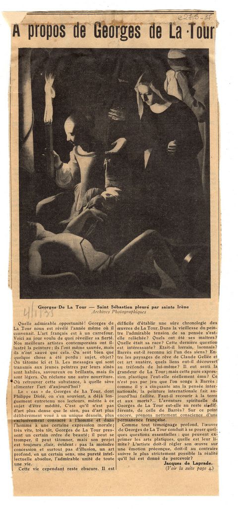 Απόκομμα, χαρτί, 2 φφ, 31×13 και 20×26 εκ., στα γαλλικά, δημοσίευσης κειμένου αφιερωμένου στη ζωγραφική του Georges de la Tour.
