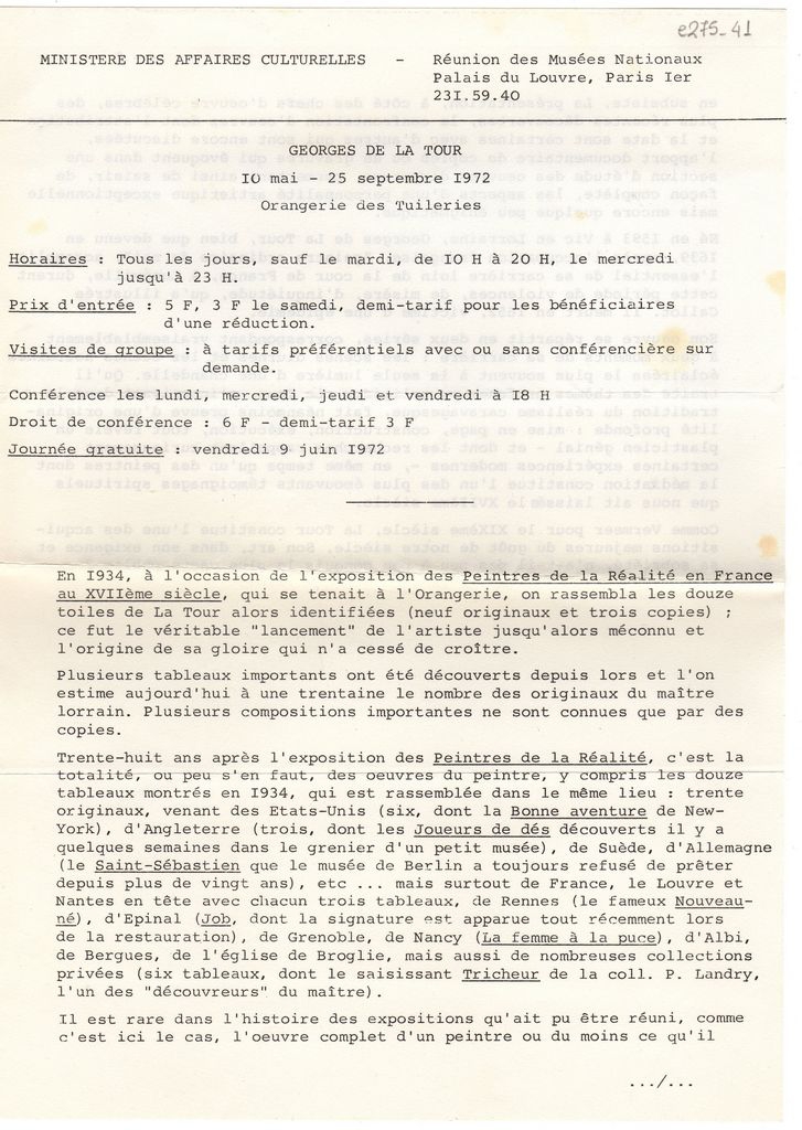 Φωτοαντίγραφο δακτυλόγραφου δελτίου τύπου, χαρτί, 30×21 εκ., στα γαλλικά, αναδρομικής έκθεσης έργων του Georges de la Tour, η οποία διεξάγεται στην Orangerie στο Παρίσι. Αναγράφονται πληροφορίες για τα έργα που παρουσιάζονται σε αυτή.