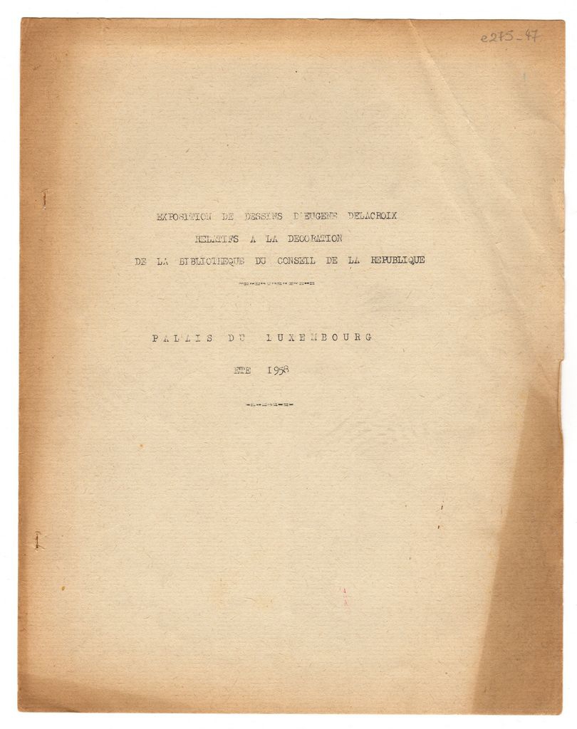 Δακτυλόγραφο έντυπο έκθεσης σχεδίων, χαρτί, 5 φφ, 27×21 εκ., στα γαλλικά του Eugène Delacroix, η οποία διεξάγεται στο Palais du Luxembourg στο Παρίσι. Περιέχει κείμενο με πληροφορίες και κατάλογο των σχεδίων.