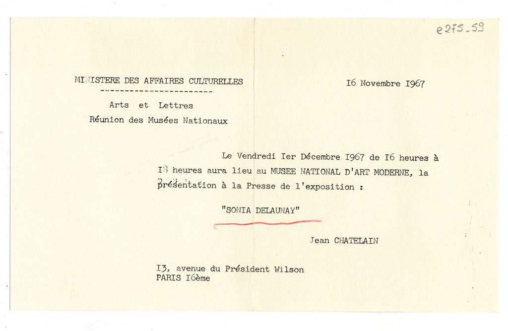 Δακτυλόγραφο απόκομμα, χαρτί, 13×21 εκ., στα γαλλικά- πρόσκληση εγκαινίων έκθεσης της Sonia Delaunay για τους εκπροσώπους του Τύπου, στο Μουσείο Μοντέρνας Τέχνης στο Παρίσι.
