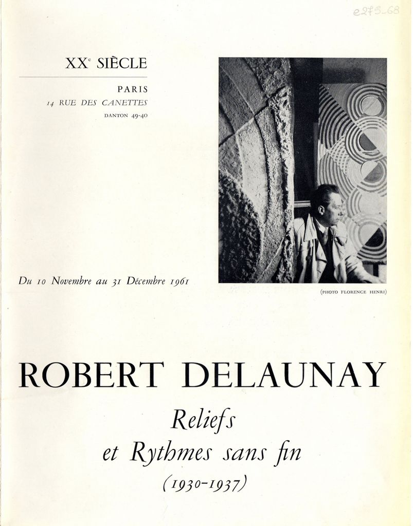 Έντυπο, χαρτί αναδιπλωμένο, 26×21 εκ., στα γαλλικά, έκθεσης έργων του Robert Delaunay στην γκαλερί “ΧΧe siècle” στο Παρίσι. Περιέχει κατάλογο των έργων που παρουσιάζονται σε αυτή. Στο οπισθόφυλλο, ευχαριστίες προς την Sonia Delaunay και τους Jean Cassou & Louis Carré.