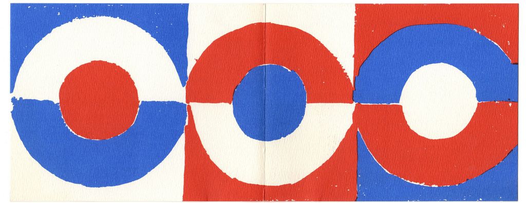 Πρόσκληση, χαρτόνι αναδιπλωμένο, 11×14 εκ., στα γαλλικά, εγκαινίων έκθεσης των Sonia και Robert Delaunay για τους εκπροσώπους του Τύπου, στην Εθνική Βιβλιοθήκη της Γαλλίας στο Παρίσι.