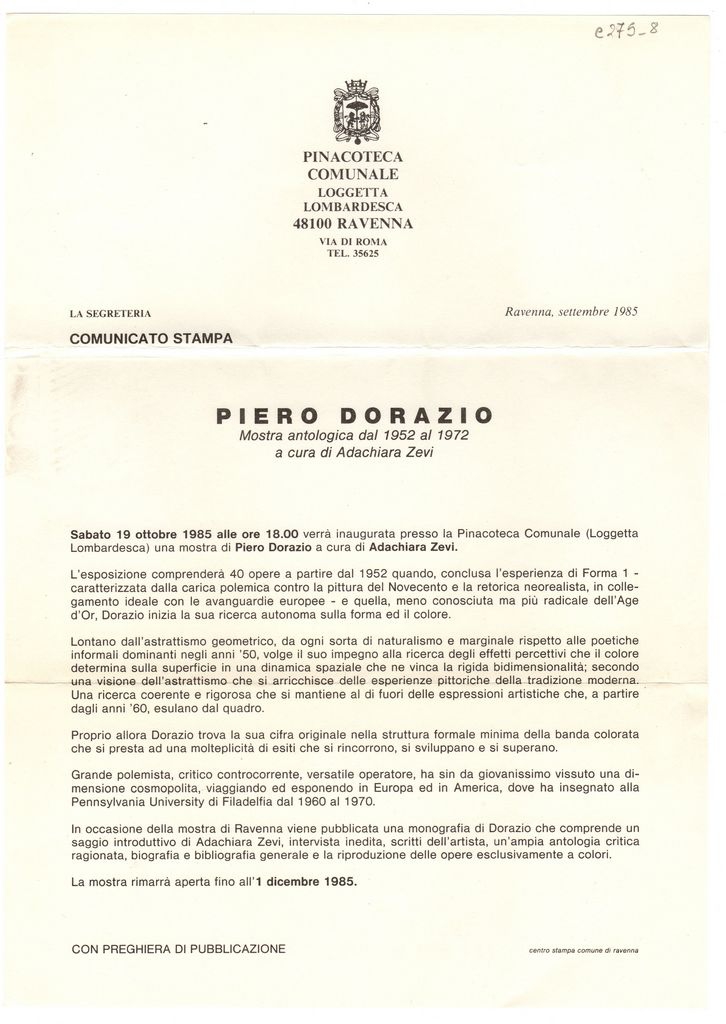 Δελτίο Τύπου, χαρτί, 30×21 εκ., στα ιταλικά, έκθεσης του Piero Dorazio στην Ραβέννα. Αναγράφονται πληροφορίες για την έκθεση και τα έργα του καλλιτέχνη που παρουσιάζονται σε αυτές, έκθεση την οποία επιμελείται η Adachiara Zevi.
