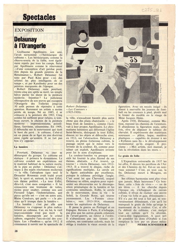 Απόκομμα, χαρτί, 28×20.5 εκ., στα γαλλικά, δημοσίευσης κριτικής έκθεσης έργων του Robert Delaunay, η οποία διεξάγεται στην Orangerie στο Παρίσι. Αναγράφονται σχόλια για τα έργα του και για τη ζωγραφική του γενικότερα.