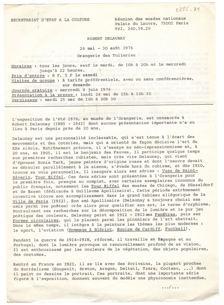 Φωτοαντίγραφο δακτυλόγραφου δελτίου τύπου, χαρτί διπλής όψης, 30×21 εκ., στα γαλλικά, αναδρομικής έκθεσης έργων του Robert Delanay, η οποία διοργανώνεται στην Orangerie στο Παρίσι. Αναγράφονται λεπτομέρειες για τη διοργάνωση και τα έργα του καλλιτέχνη που παρουσιάζονται σε αυτή.