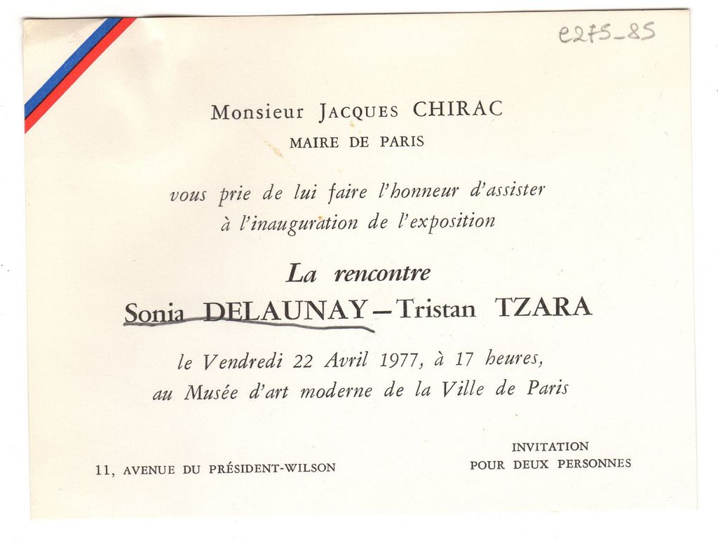 Πρόσκληση, χαρτόνι, 11×14 εκ., στα γαλλικά, εγκαινίων έκθεσης Sonia Delaunay, στην οποία παρουσιάζονται έργα της που φιλοτέχνησε κατά την γνωριμία και επιρροή της από τον Tristan Tzara.