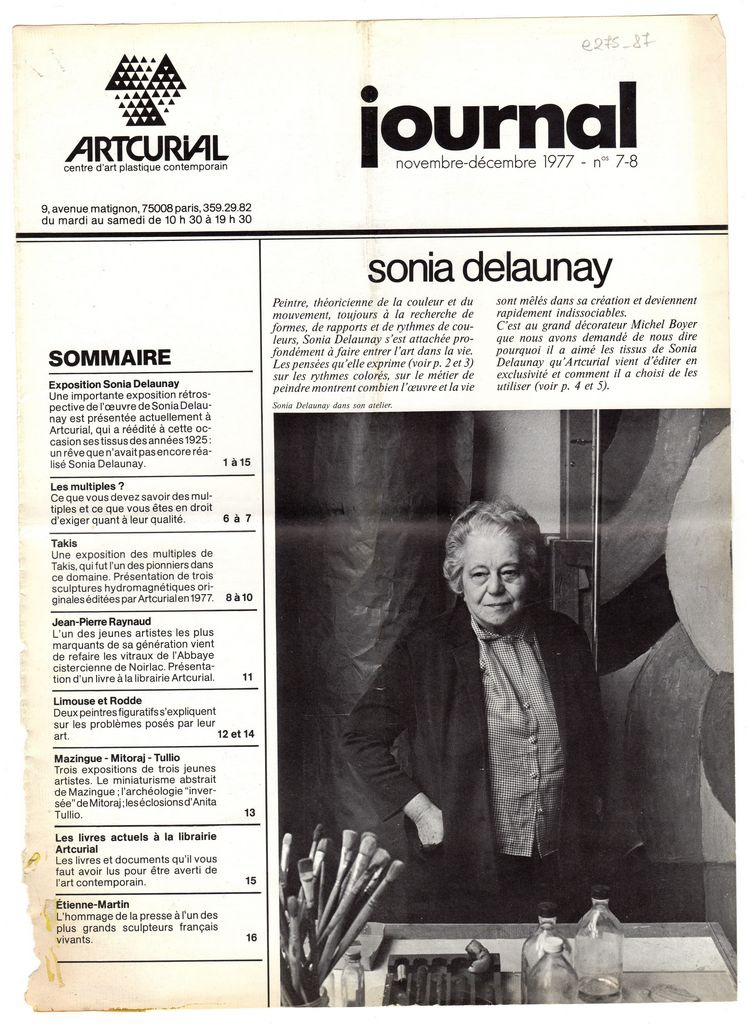 Απόκομμα, χαρτί, 2 φφ, 30×22 εκ., στα γαλλικά, δημοσίευσης αφιερωμένης στην Sonia Delaunay, με αφορμή αναδρομική έκθεση έργων της στην Artcurial στο Παρίσι. Αναγράφονται αποσπάσματα δηλώσεων-κρίσεων της καλλιτέχνιδας, συνέντευξη του Michel Boyer, αναφορικά με τη δημιουργία ενδημάτων από την καλλιτέχνιδα και την έκθεση που διοργανώνεται. Επίσης, αναφορά γίνεται σε βιβλία που κυκλοφόρησαν για το έργο της κατά το διάστημα 1971-1976.