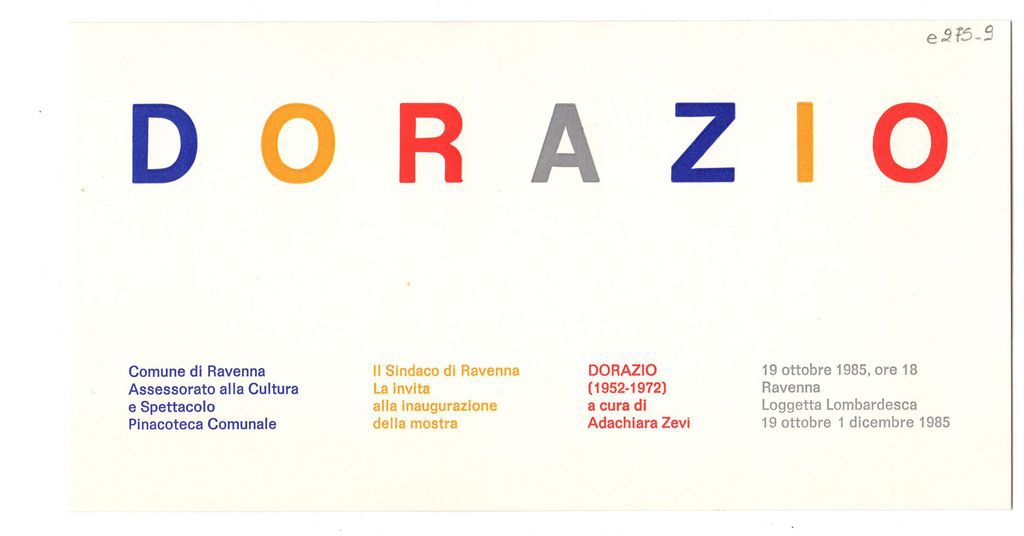 Πρόσκληση, χαρτόνι, 10,5×20 εκ., στα ιταλικά, εγκαινίων έκθεσης του Piero Dorazio στην Ραβέννα.