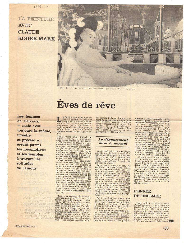 Απόκομμα, χαρτί διπλής όψης, 36 x 27 εκ., στα γαλλικά, δημοσίευσης στήλης του εντύπου με τίτλο “La Peinture avec Claude Roger Marx”, στην οποία σχολιάζονται εκθέσεις και εικαστικά δρώμενα της περιόδου. Στο παρόν, κριτική έκθεσης του Paul Delvaux στην Orangerie στο Παρίσι, κριτική έκθεσης Hans Bellmer στην Galerie Petit. Ακόμη, κριτική έκδοσης με τίτλο “Eros ou l’ Amour peintre” του Florent Fels.