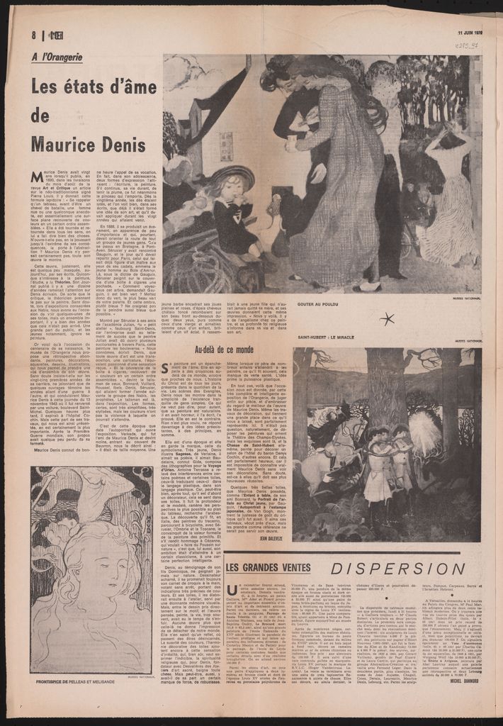 Απόκομμα, χαρτί, 60×43 εκ., στα γαλλικά, δημοσίευσης κριτικής έκθεσης του Maurice Denis, η οποία διεξάγεται στην Orangerie στο Παρίσι.