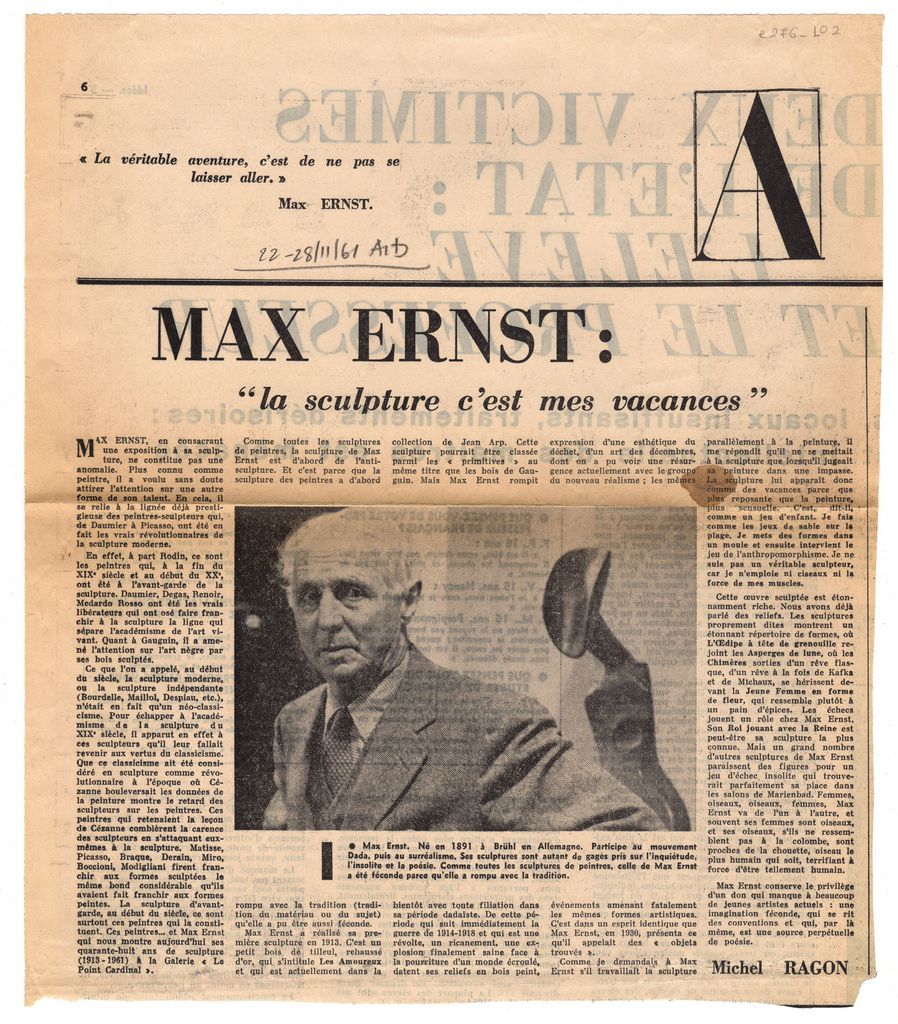 Απόκομμα, χαρτί, 30×27 εκ., στα γαλλικά, δημοσίευσης κειμένου το οποίο αναφέρεται και σχολιάζει την γλυπτική του Max Ernst.