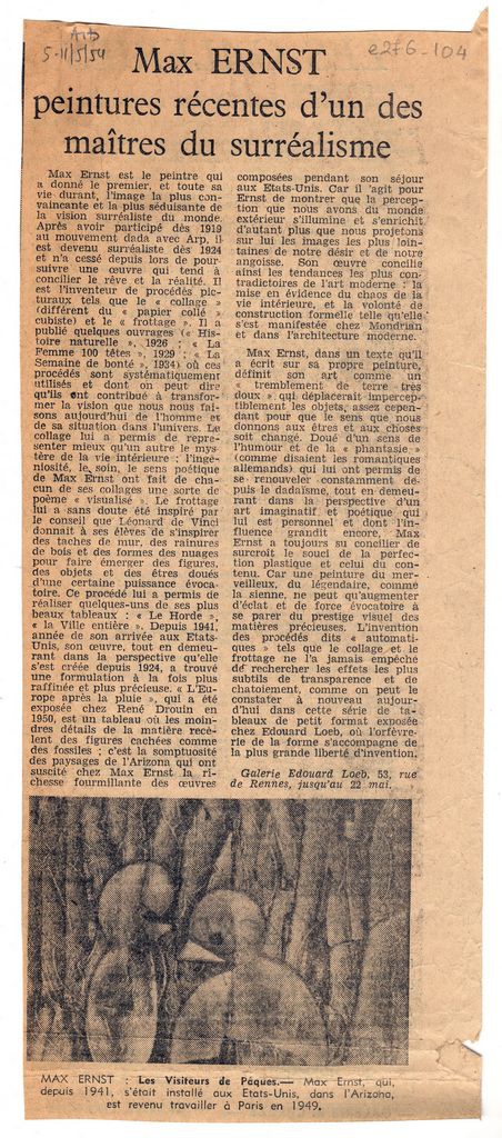 Απόκομμα, χαρτί, 26.5×11.5 εκ., στα γαλλικά, δημοσίευσης κριτικής έκθεσης του Max Ernst, η οποία διεξάγεται στο Παρίσι. Σχολιάζονται έργα του.