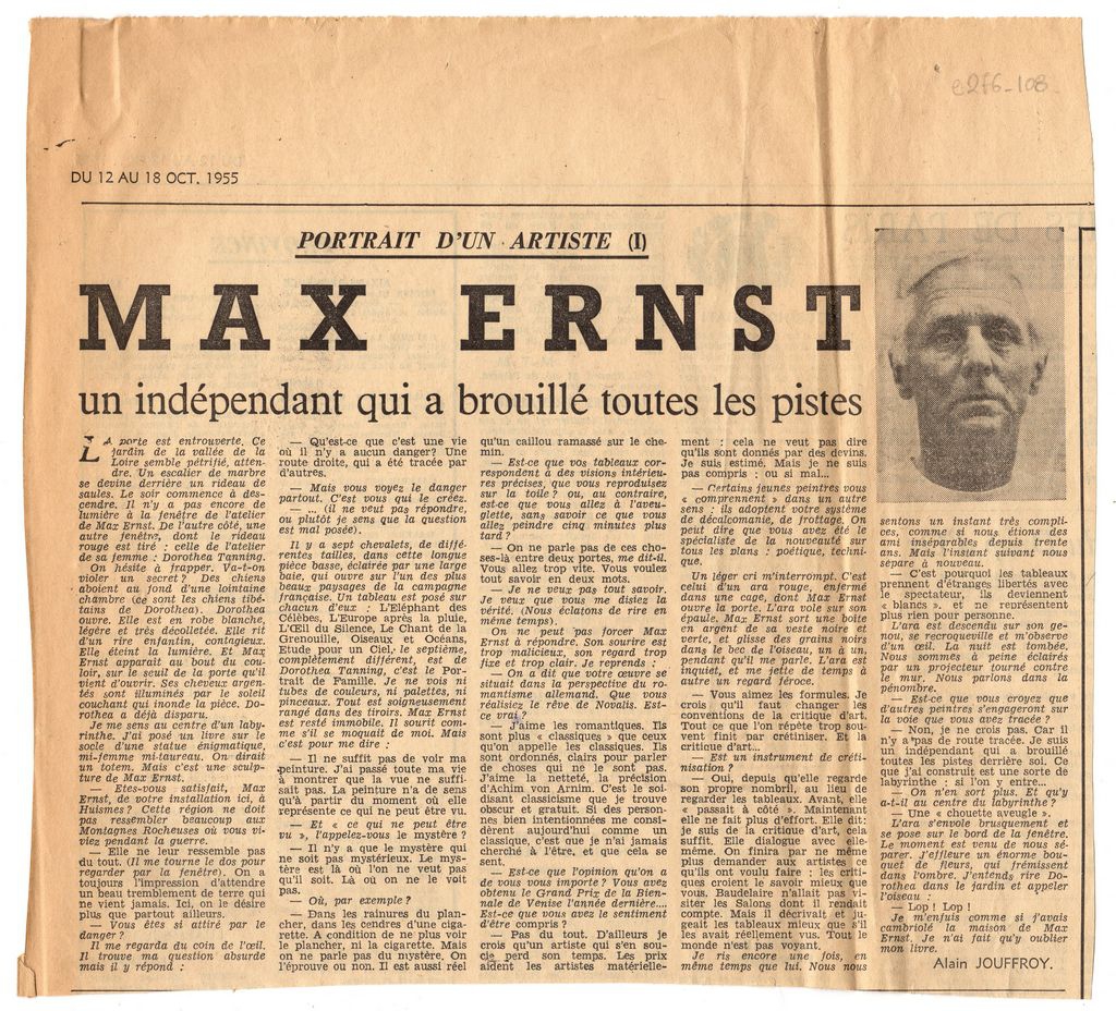Απόκομμα, χαρτί, 24×26 εκ., στα γαλλικά, δημοσίευσης συνέντευξης του Max Ernst στον Alain Jouffroy.