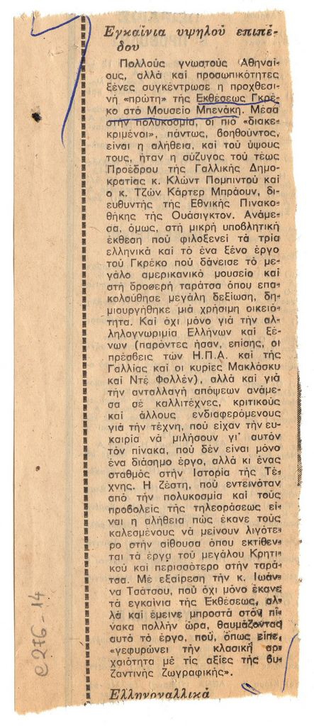 Απόκομμα, χαρτί συρραμένο σε έντυπο, 18×12 εκ., δημοσίευσης άρθρου αναφερόμενου στα εγκαίνια έκθεσης έργων του Δομήνικου Θεοτοκόπουλου στο Μουσείο Μπενάκη στην Αθήνα.