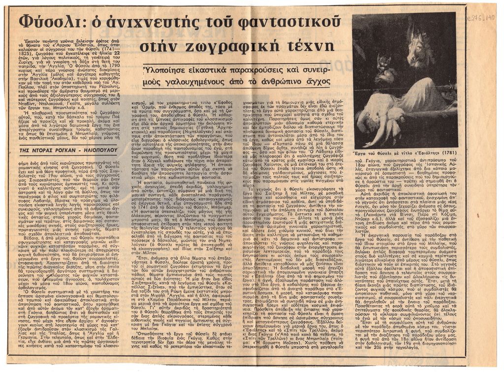 Απόκομμα, χαρτί, 23×31 εκ., στα ελληνικά, δημοσίευσης κειμένου αφιερωμένου στη ζωγραφική του Henry Fuseli.