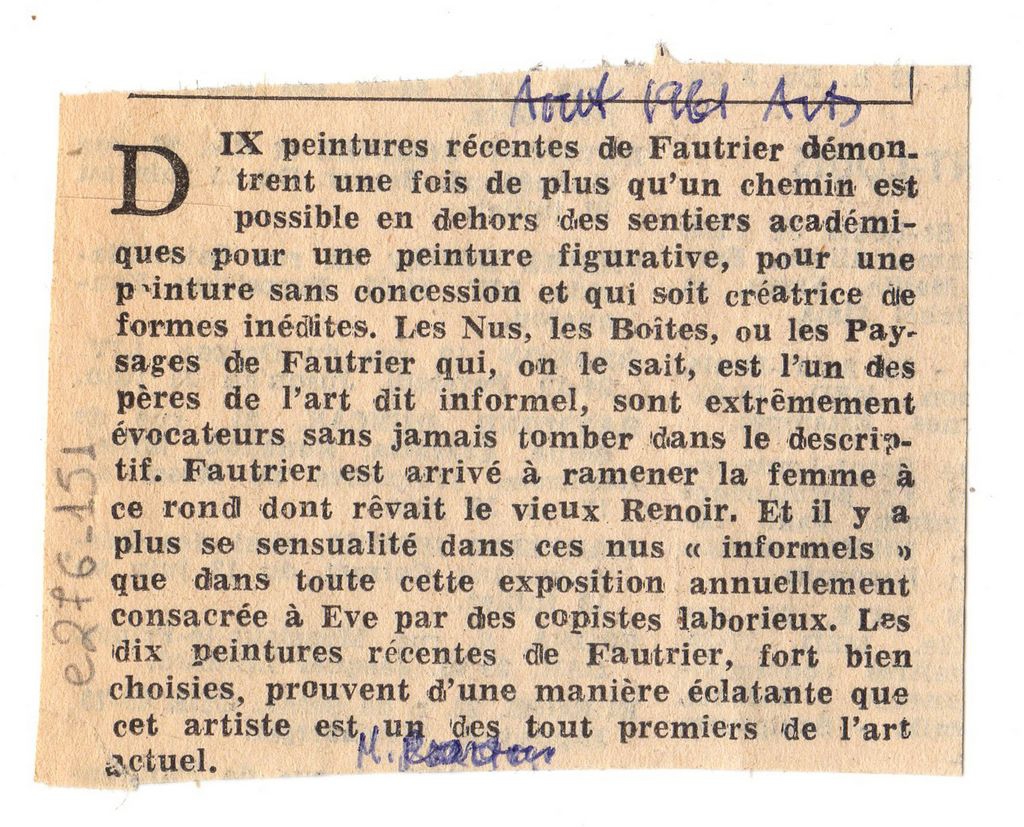 Απόκομμα, χαρτί, 6×8 εκ., στα γαλλικά, δημοσίευσης κριτικής έργων του Jean Fautrier τα οποία παρουσιάζονται σε έκθεσή του.