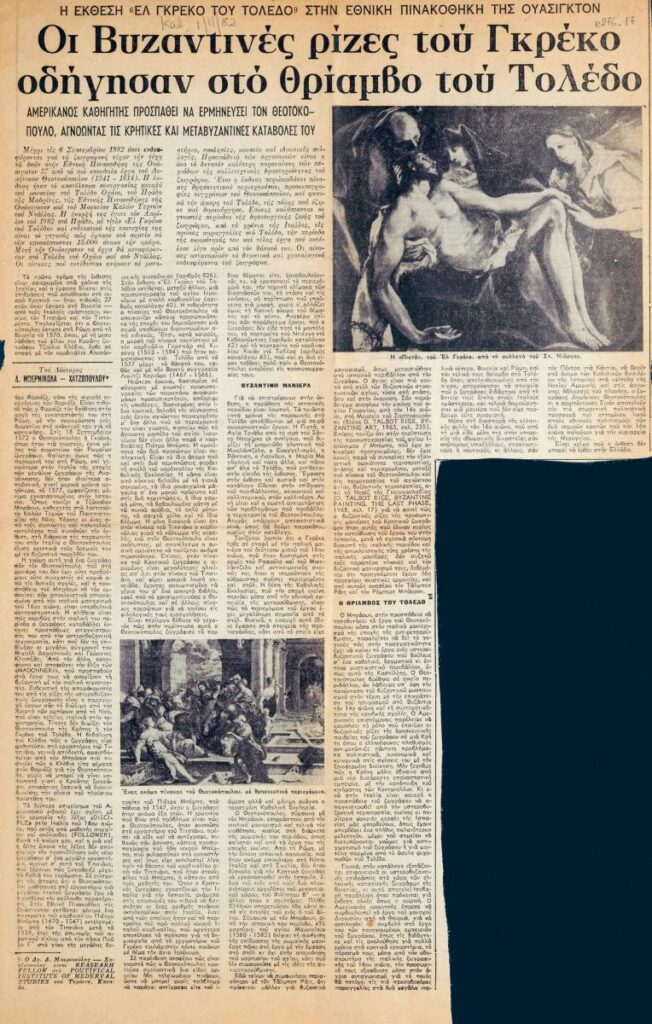 Απόκομμα της εφημερίδας “Η Καθημερινή” (01/11/1982), όπου δημοσιεύεται άρθρο, το οποίο αναλύει την επιρροή της βυζαντινής τέχνης στο έργο του Δομήνικου Θεοτοκόπουλου, με αφορμή έκθεση έργων του καλλιτέχνη, η οποία διεξάγεται στην Εθνική Πινακοθήκη της Ουάσιγκτον.