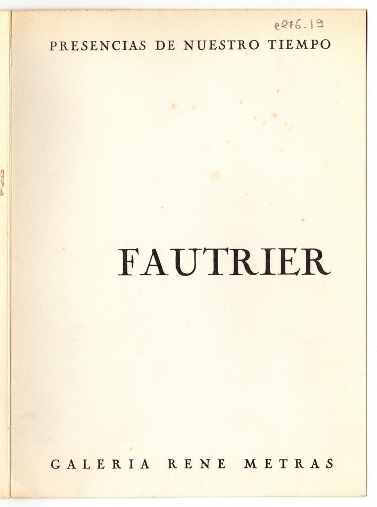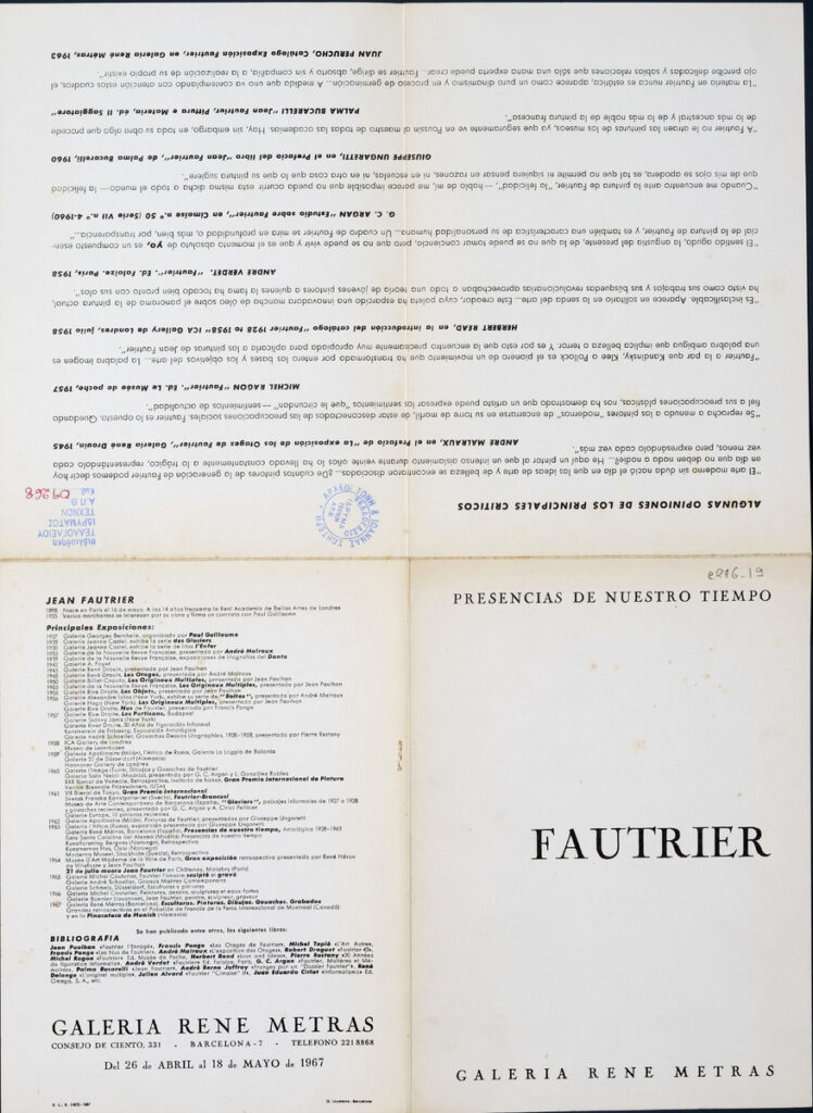 Απόκομμα, χαρτόνι δίπτυχο, 23×16.5 εκ., στα ισπανικά, έκθεσης του Jean Fautrier στη Βαρκελώνη. Περιέχει βιογραφικό σημείωμα του καλλιτέχνη, κριτικές για το έργο του και εικονογραάφηση.