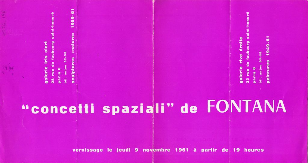 Έντυπο, χαρτόνι διπλής όψης, 34×18 εκ., στα γαλλικά, παράλληλων εκθέσεων του Lucio Fontana, οι οποίες διεξάγονται στις γκαλερί Iris Clert και Rive Droite στο Παρίσι.