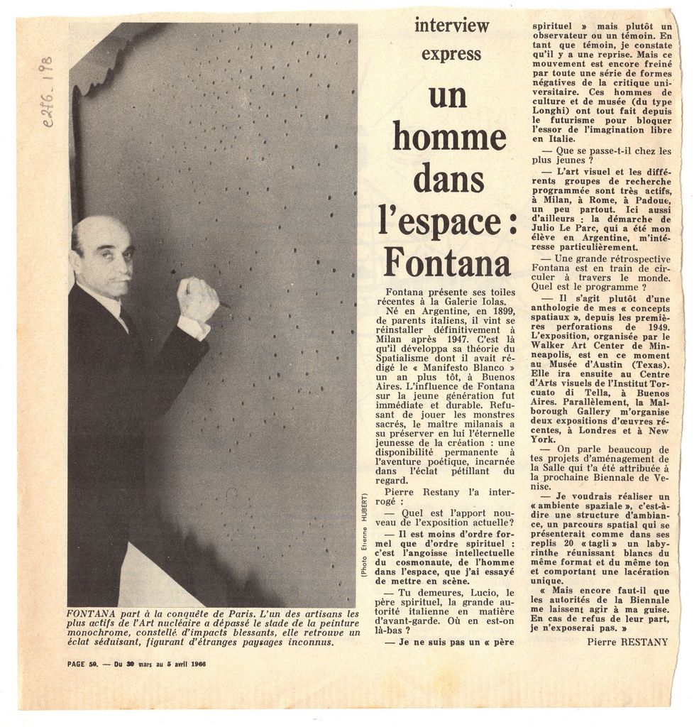 Απόκομμα, χαρτί, 22.5×21.5 εκ., στα γαλλικά, δημοσίευσης συνέντευξης του Lucio Fontana στον Pierre Restany, με αφορμή έκθεση του καλλιτέχνη στην γκαλερί Ιόλα στο Παρίσι.