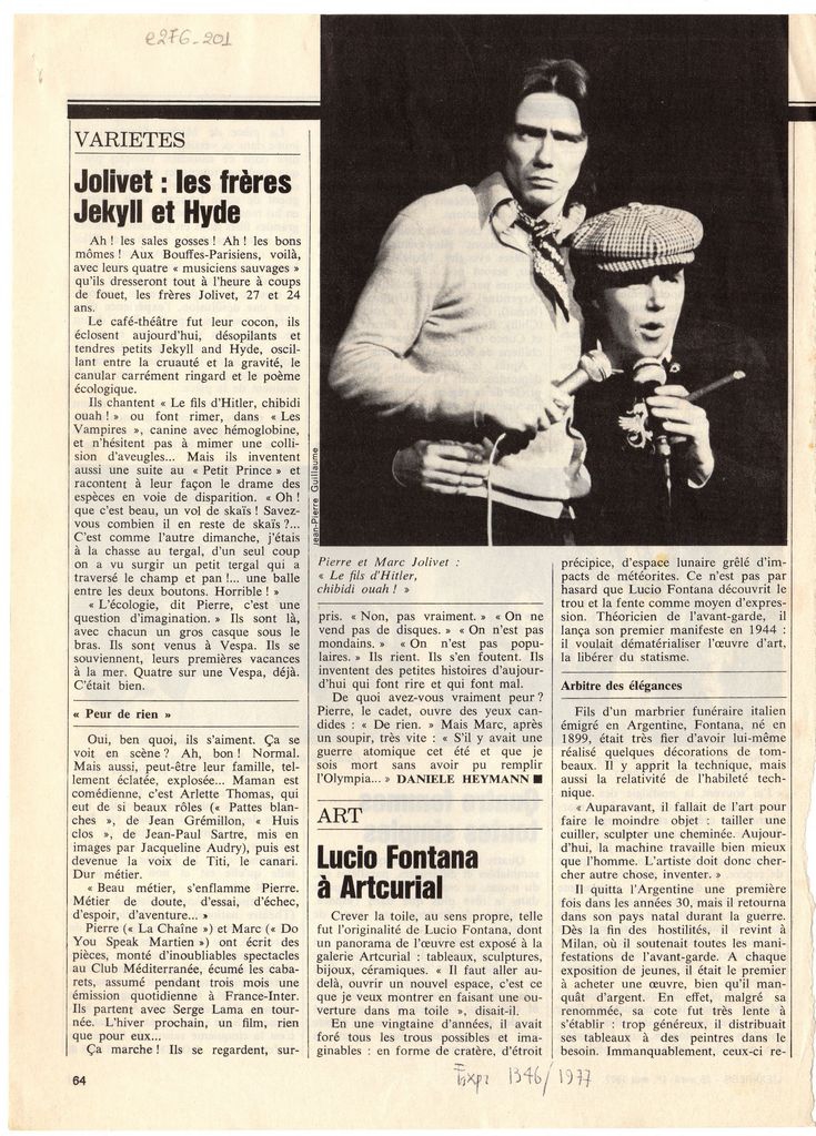 Απόκομμα, χαρτί, 2 φφ, 28×21 εκ., στα γαλλικά, δημοσίευσης κριτικής έκθεσης Lucio Fontana στην Artcurial στο Παρίσι. Αναγράφονται βιογραφικά του καλλιτέχνη και σχόλια για τα έργα που παρουσιάζονται στην έκθεση.