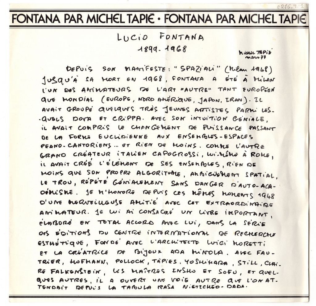 Έντυπο, χαρτόνι διπλής όψης, 23.5×23.5 εκ., στα γαλλικά, με κείμενο του Michel Tapié αφιερωμένο στον Lucio Fontana. Στην πίσω όψη, πληροφορίες για τον καλλιτέχνη.