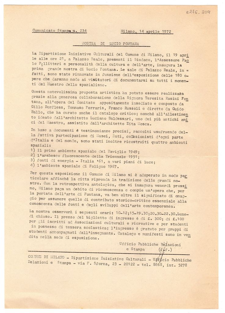 Δακτυλόγραφο δελτίο τύπου, χαρτί, 30×21 εκ., στα ιταλικά, αναδρομικής έκθεσης Lucio Fontana, η οποία διεξάγεται στο Palazzo Reale στο Μιλάνο. Αναγράφονται πληροφορίες για τη διοργάνωση της έκθεσης.