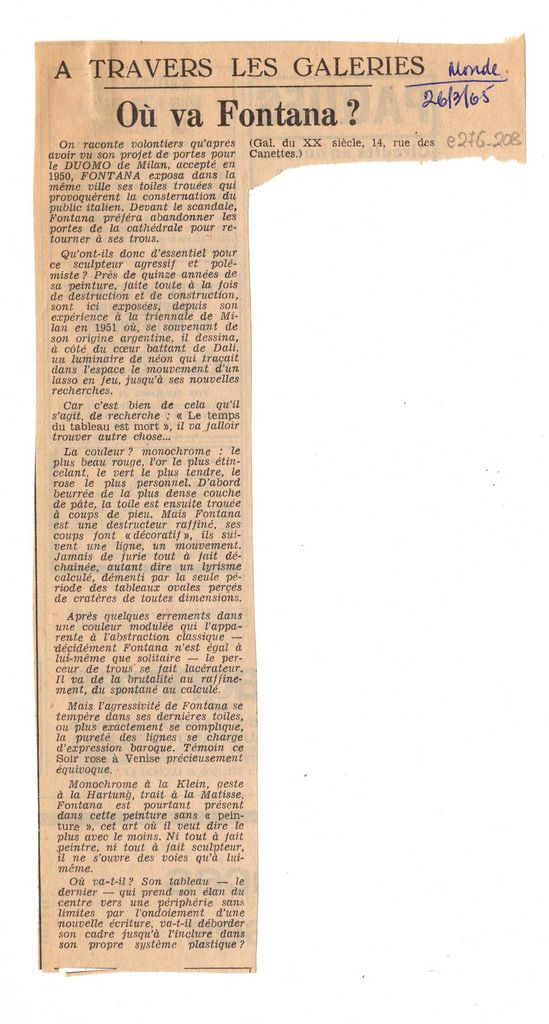 Απόκομμα, χαρτί ακανόνιστου μεγέθους, στα ιταλικά, δημοσίευσης κριτικής έκθεσης του Lucio Fontana, η οποία διεξάγεται στην γκαλερί XXe Siècle στο Παρίσι.