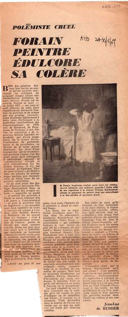 Απόκομμα, χαρτί ακανόνιστου μεγέθους, στα γαλλικά, δημοσίευσης κριτικής έκθεσης του Jean Louis Forain, η οποία διεξάγεται στην γκαλερί Reichenbach στο Παρίσι.