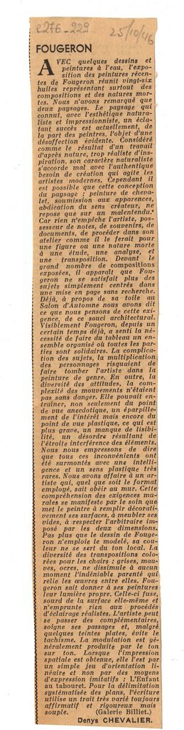 Απόκομμα, χαρτί, 29×5 εκ., στα γαλλικά, δημοσίευσης κριτικής έκθεσης του André Fougeron, η οποία διεξάγεται στην γκαλερί Billiet στο Παρίσι.