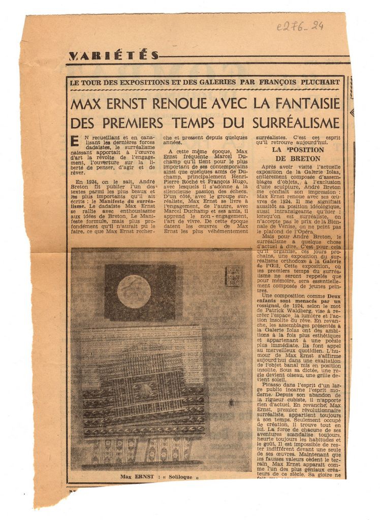 Απόκομμα, χαρτί, 24,5×17 εκ., στα γαλλικά, δημοσίευσης άρθρου το οποίο αναφέρεται στη σχέση του Max Ernst με τον σουρρεαλισμό, με αφορμή έκθεσή του η οποία διεξάγεται στην γκαλερί Alexandre Iolas στο Παρίσι. Στο ίδιο άρθρο γίνεται αναφορά στην γνωριμία του με τον Marcel Duchamp.