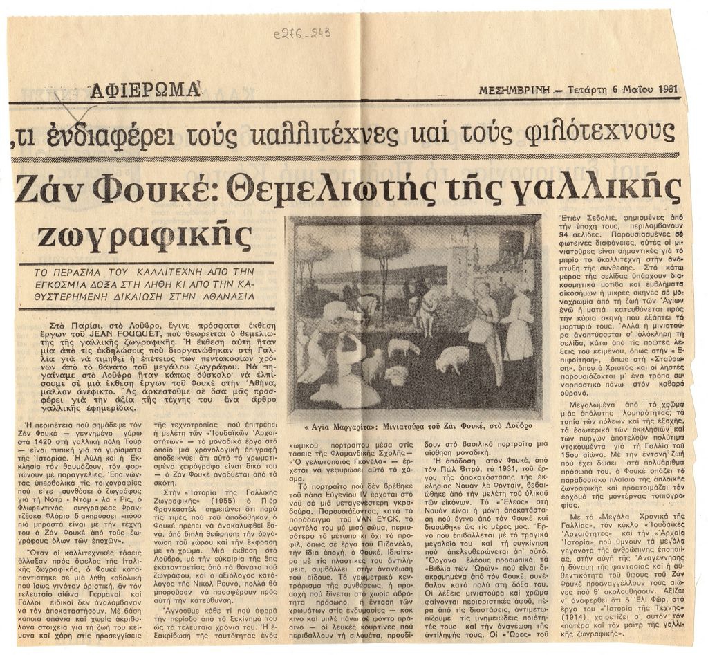 Απόκομμα, χαρτί, 23,5×25 εκ., στα ελληνικά, δημοσίευσης άρθρου το οποίο αναφέρεται σε αναδρομική έκθεση Jean Fouquet, η οποία διεξάγεται στο Λούβρο στο Παρίσι, στο πλαίσιο επετειακών εκδηλώσεων για την συμπλήρωση 500 χρόνων από τον θάνατο του καλλιτέχνη.