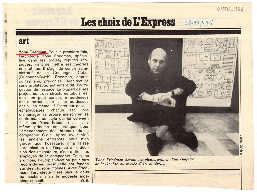 Απόκομμα, χαρτί, 15×20.5 εκ., στα γαλλικά, δημοσίευσης άρθρου το οποίο αναφέρεται στην αρχιτεκτονική του Yona Friedman και στην υλοποίηση της θεωρίας του στην Compagnie Cdc στη Γαλλία.