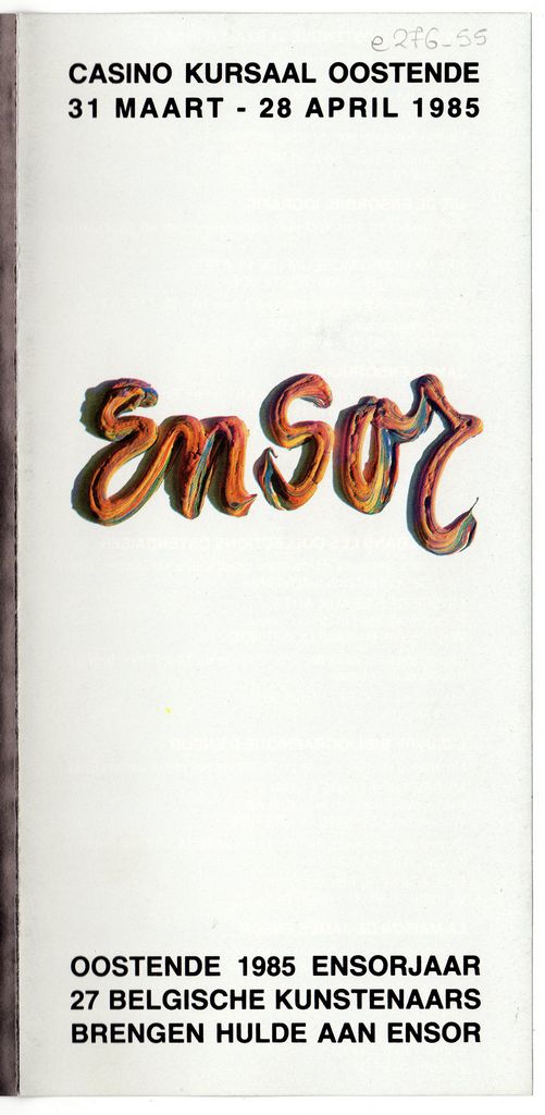 Έντυπο, χαρτόνι πολύπτυχο, 21×10 εκ., στα ολλανδικά, γαλλικά, αγγλικά, γερμανικά, έκθεσης αφιερωμένης στον James Ensor, με αφορμή την επέτειο συμπλήρωσης 125 χρόνων από τη γέννησή του. Στην έκθεση συμμετέχουν Βέλγοι ζωγράφοι: οι Piet Bekaert, Fred Bervoets, Jean Bilquin, Maurice Boel, André Bogaert, Jan Burssens, Paul Delvaux, Karel Dierickx, Felix Labisse, Octave Landuyt, Lismonde, Pol Mara, Jean Milo, Frans Minnaert, Hubert Minnebo, Yves Rhaye, Christian Silvain, Roger Somville, Charles Szymkowicz, Paul Van Hoeydonck, Maurits Van Saene, Jef Van Tuerenhout, José Vermmersch, Godfried Vervisch, Pierre Vlerick, Joseph Willaert, Henri Wolvens. Αναγράφονται πληροφορίες για την έκθεση καθώς και για τις συλλογές όπου φυλάσσονται έργα του καλλιτέχνη με πρακτικές για το κοινό πληροφορίες. Το έντυπο εικονογραφείται.