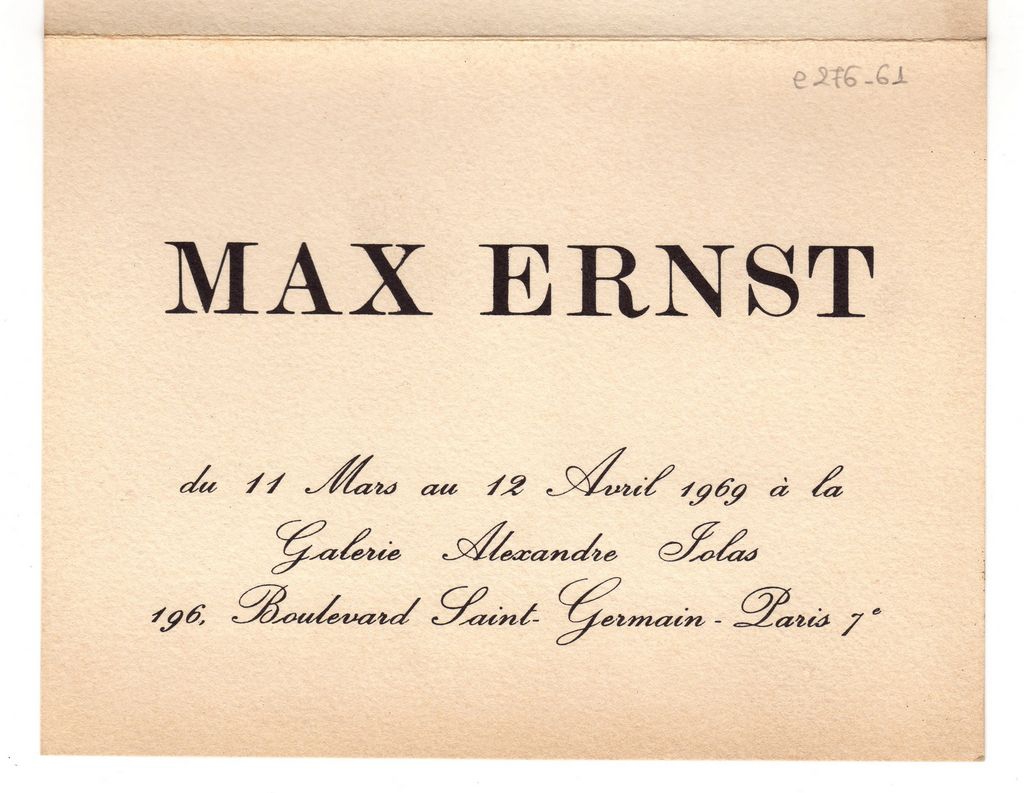 Έντυπο, χαρτόνι αναδιπλωμένο, 13×16.5 εκ., στα γαλλικά, έκθεσης Max Ernst, στην γκαλερί Alexandre Iolas στο Παρίσι.