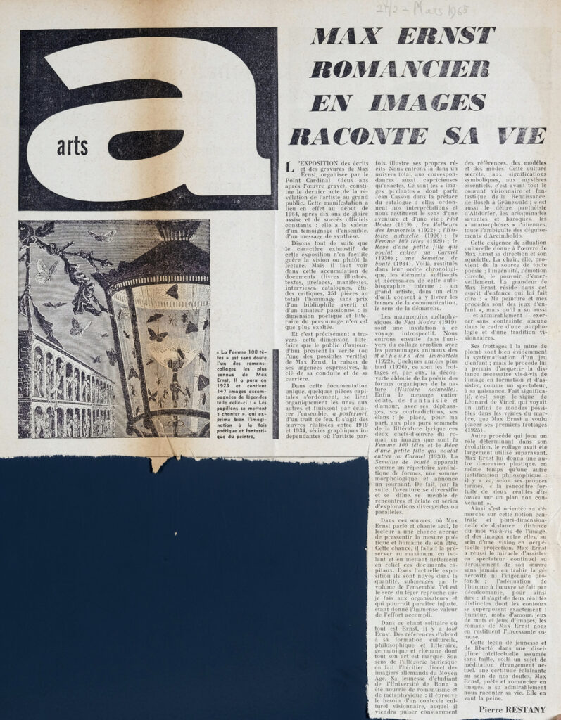 Απόκομμα, χαρτί ακανόνιστου μεγέθους, στα γαλλικά, δημοσίευσης κριτικής έκθεσης του Max Ernst, η οποία διεξάγεται στην γκαλερί Le Point Cardinal στο Παρίσι. Παρουσιάζονται χειρόγραφα και χαρακτικά του καλλιτέχνη, τα οποία σχολιάζονται στο παρόν.