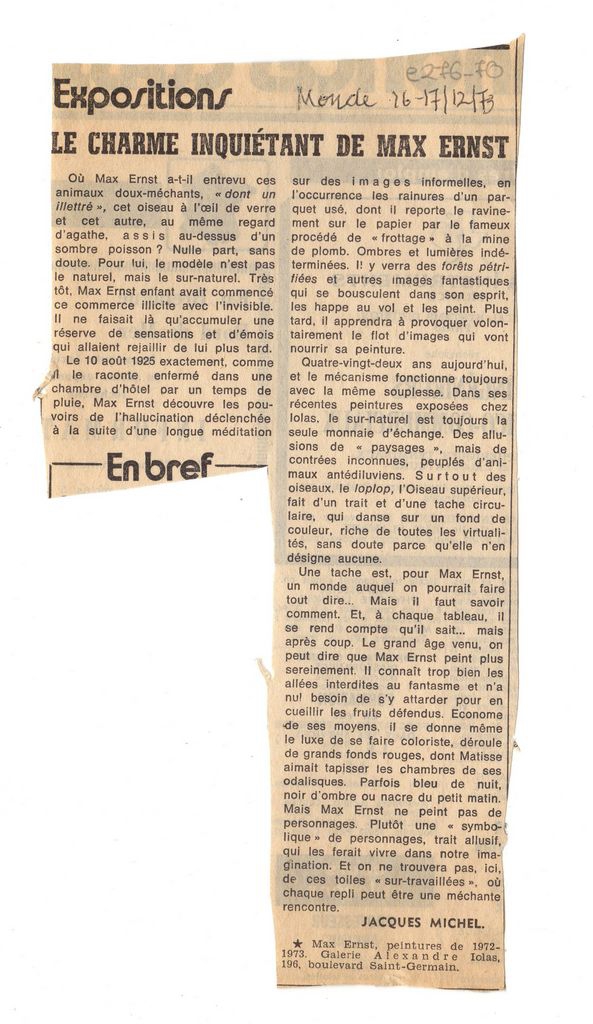 Απόκομμα, χαρτί ακανόνιστου μεγέθους, στα γαλλικά, δημοσίευσης κριτικής αναδρομικής έκθεσης Max Ernst, η οποία διεξάγεται στην γκαλερί Ιόλα στο Παρίσι.